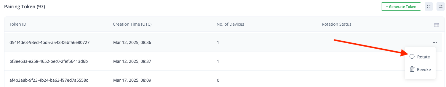 2. In the row of the relevant Token ID, click the **More** icon (three dots) on the far right and choose **Rotate**.