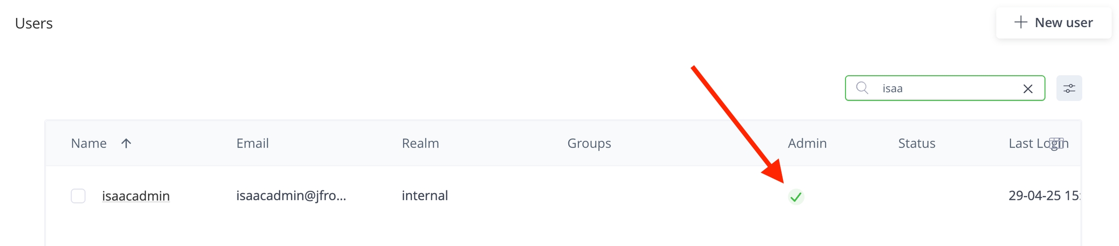 For the user to be an admin in Connect, the user must be an admin in the Platform. In the list of Users in JFrog Platform, search for the user and ensure that the user is already indicated as an admin.