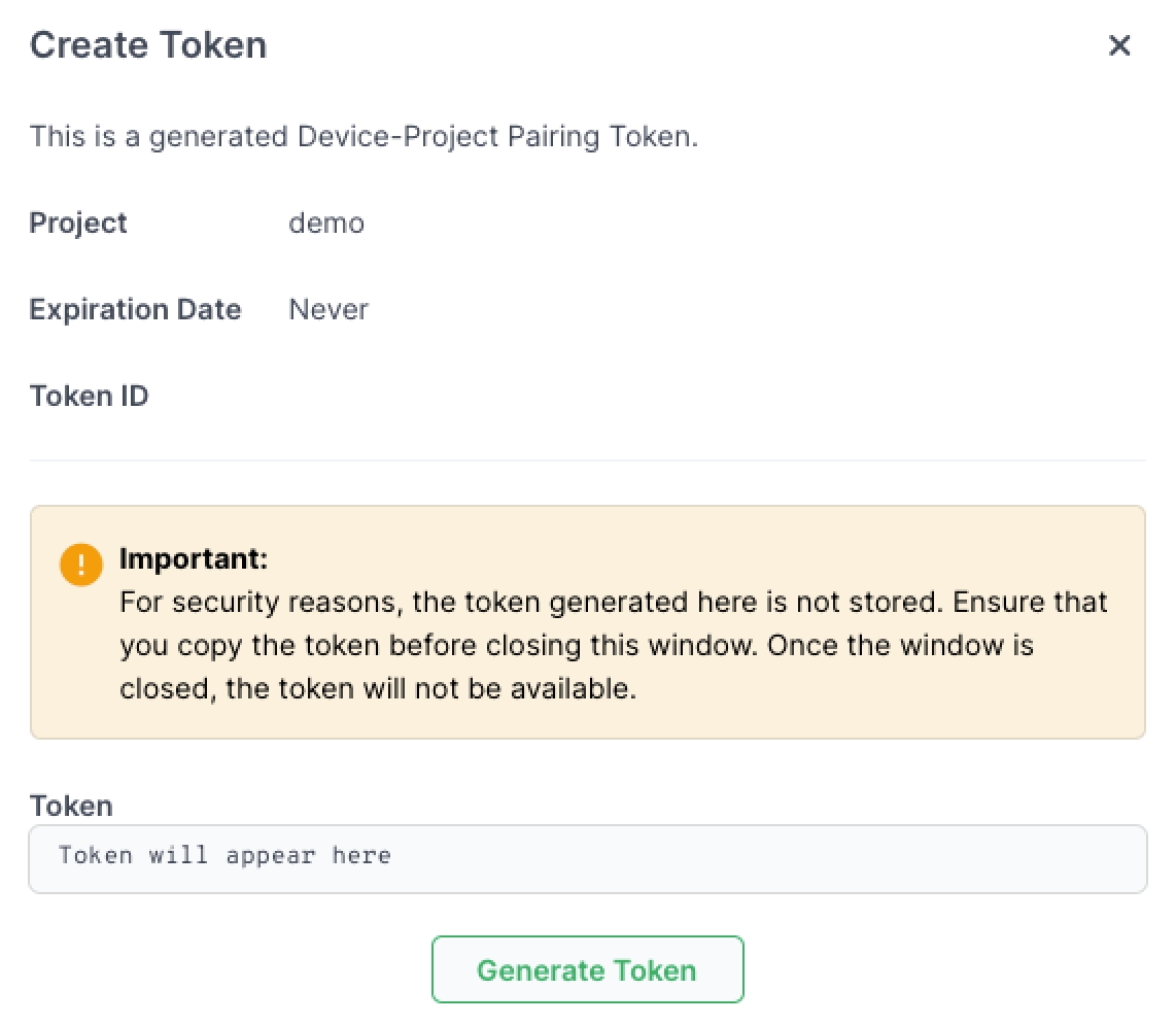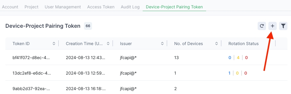 Go to the Device-Project Pairing Token tab in Settings and click Create (+).