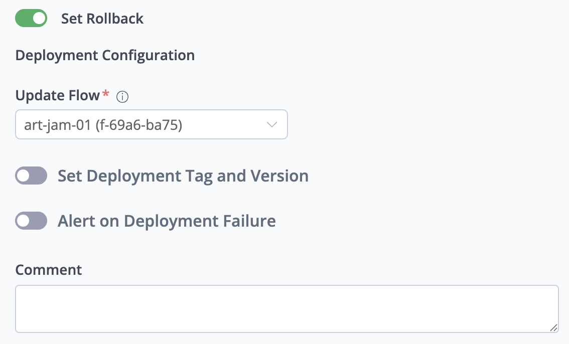 3. Complete the other parts of the rollback configuration (Set Deployment Tag and Version, Alert on Update Failure, and Comment).