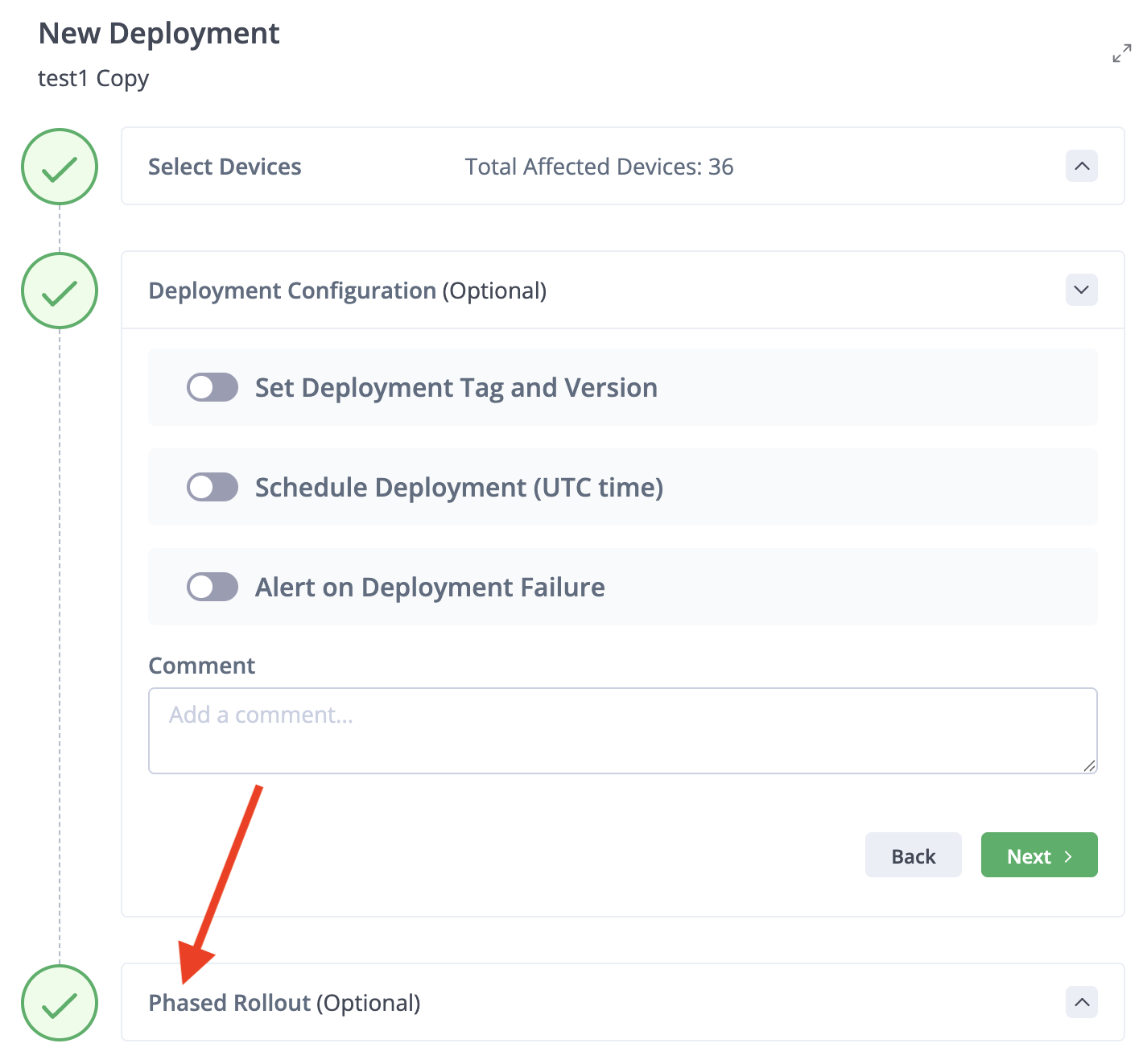 When you configure the deployment, just like in a regular deployment, you will create a filter that includes all the devices to be deployed. Then you will choose a tag (e.g., `phase-1`) that tells Connect which devices to include in Phase 1. For the second phase, Connect automatically deploys to the remaining devices in your deployment filter. (You do not have to tag devices for the last phase.)