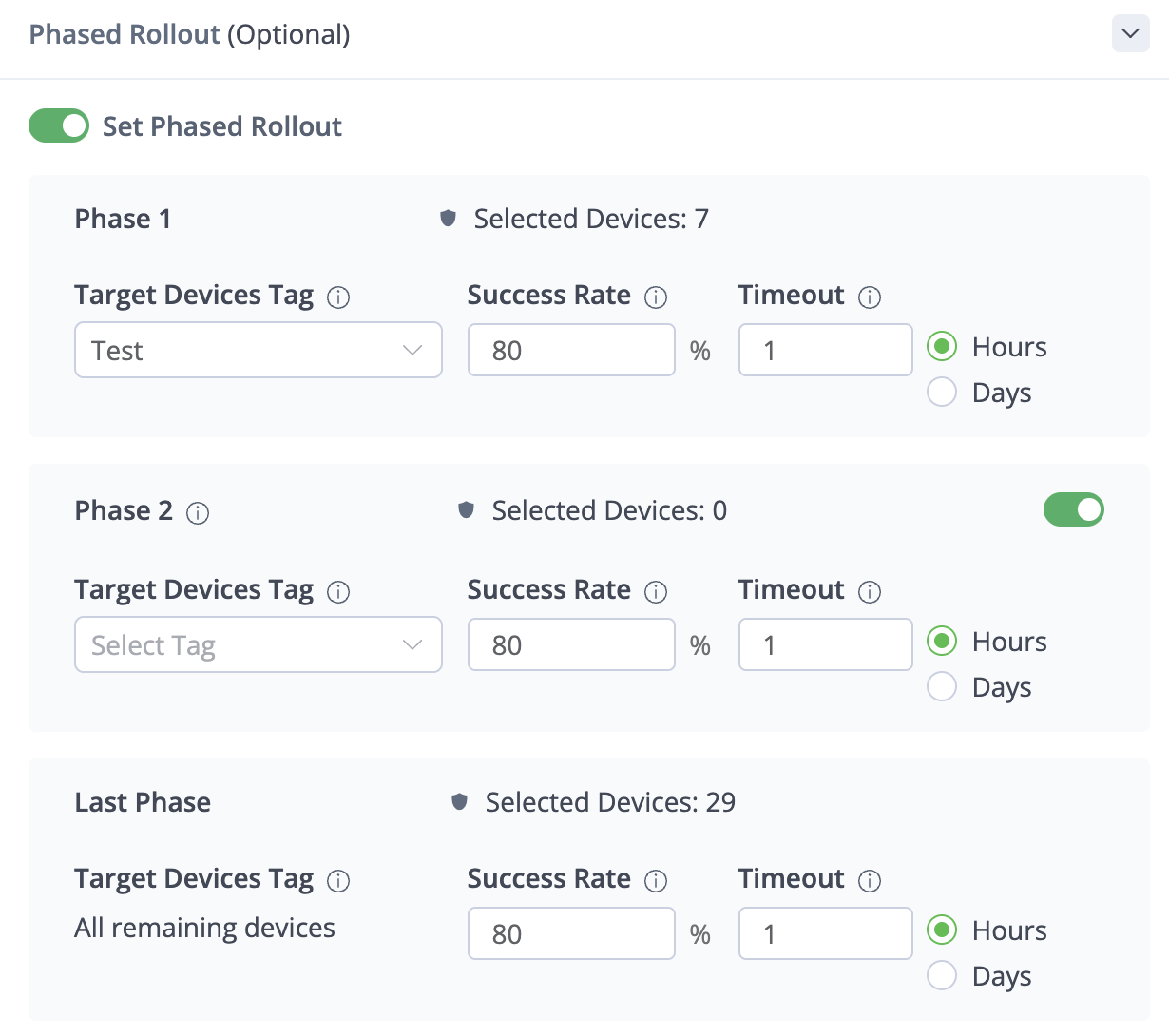 3. **Configure Phases**: Choose the `phase-1` tag for Phase 1 and the `phase-2` tag for Phase 2. For phase 3, all the rest of the devices having application HomeAssist v5 will be updated.&#x20;