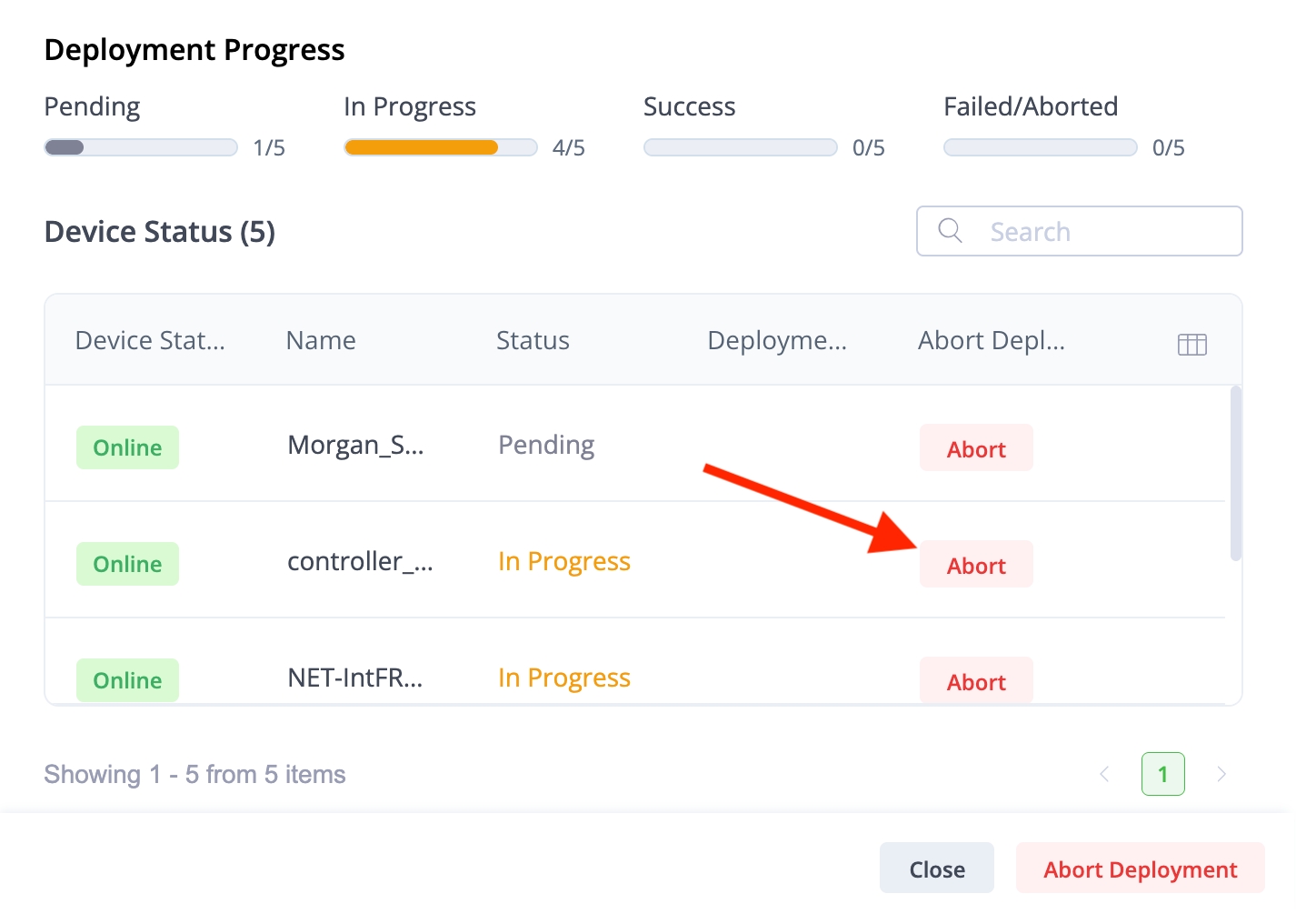 You can abort a deployment to a specific device when the deployment is in Pending or In Progress state.