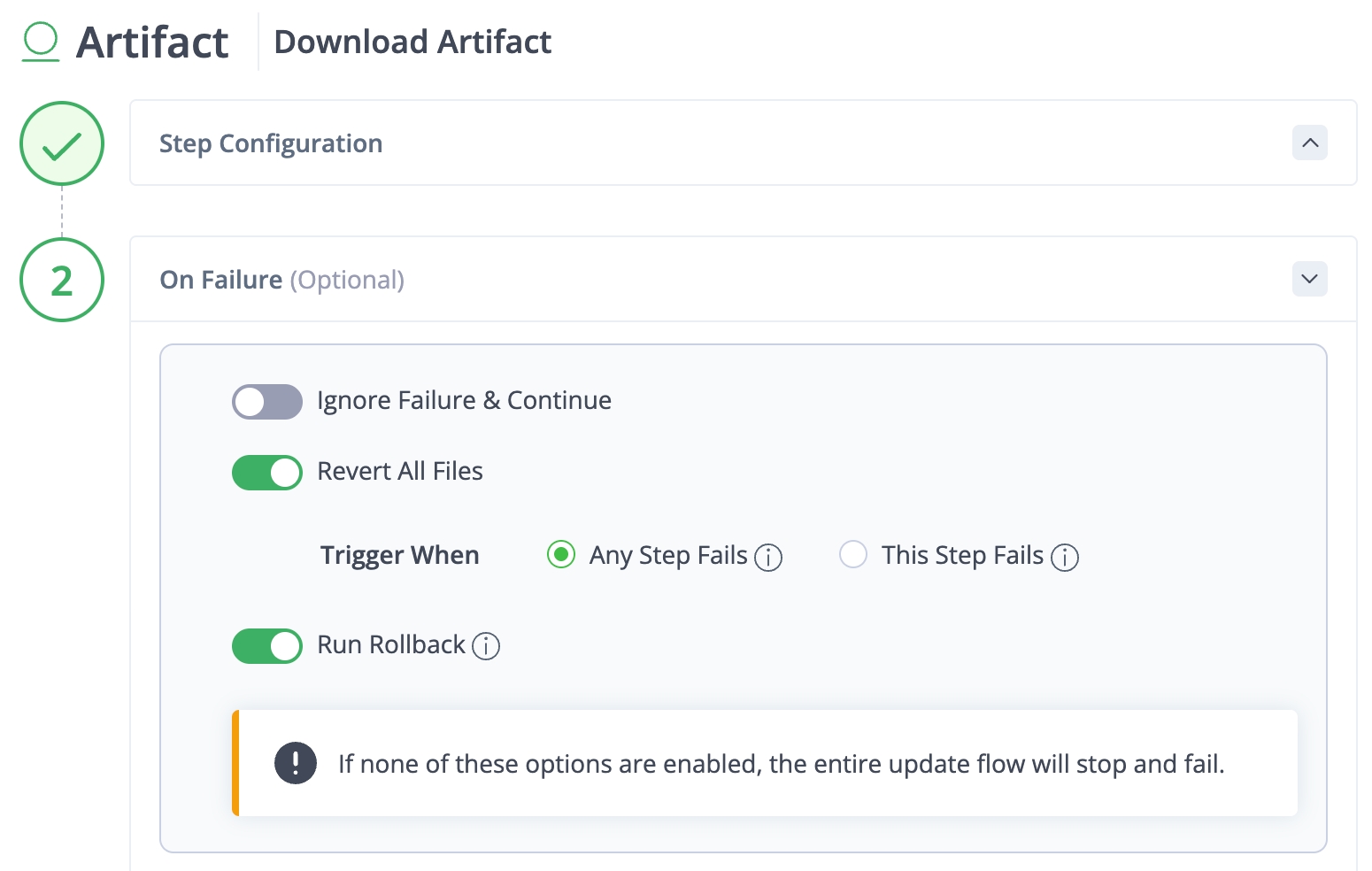 Any step fails: If this step or a subsequent step fails, then the rollback action specified will be triggered. If a subsequent step fails and has Ignore Failure & Continue defined, then the action will not be triggered. (This option requires Connect Agent version 6.0 or later.)