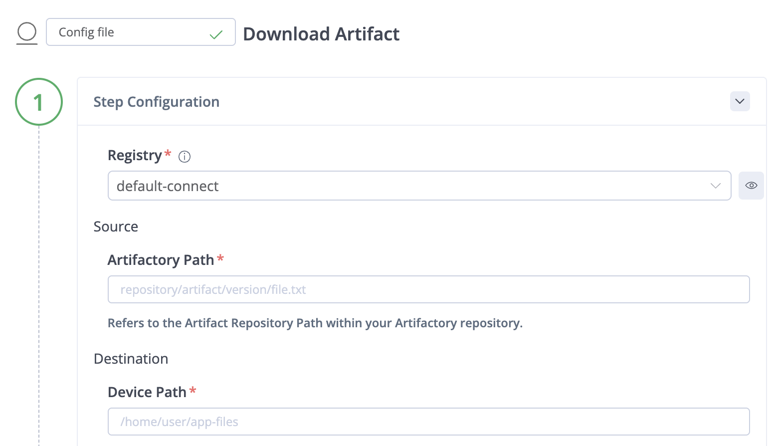 The Download Artifact step type enables you to deploy updates to your devices by specifying a path in JFrog Artifactory to a destination path on your device.