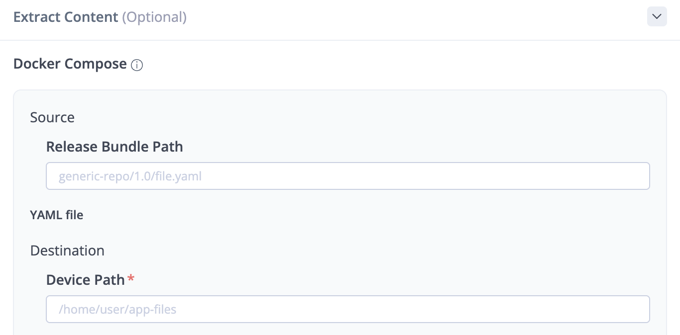 Docker Compose: (Optional) If your release bundle includes Docker images, specify the Release Bundle Path and the Device Path for the Docker Compose YAML file.