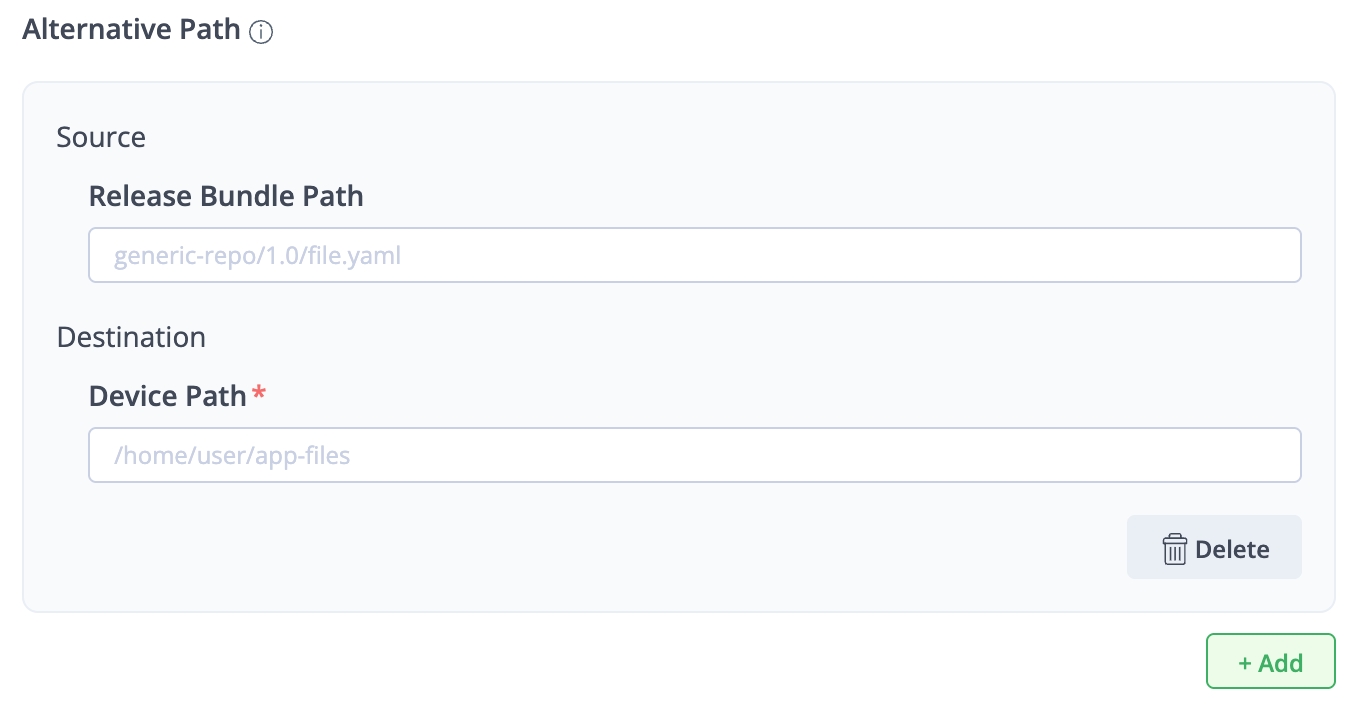 Alternative Path: (Optional) If you have one or more files in your release bundle that need to go to different paths on the edge device, click Add. Then specify the Release Bundle Path and the Device Path for each file.