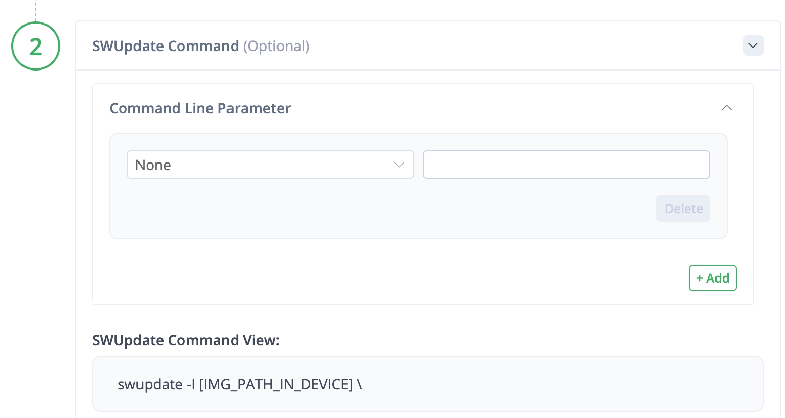 The step runs SWUpdate CLI commands like the default command shown below. You can enter additional commands and run options for the step to run on the device. For each additional command, click Add and choose the Command and Run options. The display at the bottom enables you to review the full command that will be run before you save the step.