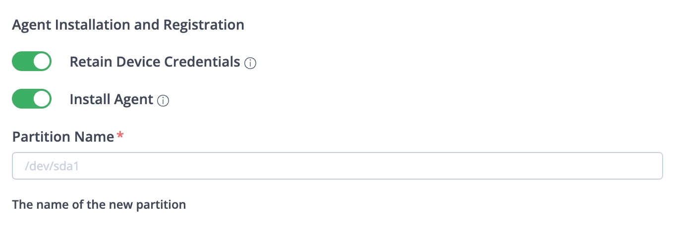 Retain Device Credentials: Mark this to keep the current device credentials in the new image. If you leave it unmarked, you will need to register the device again after the deployment is completed. This option is recommended if you want to install a new agent version and keep the previous device credentials.