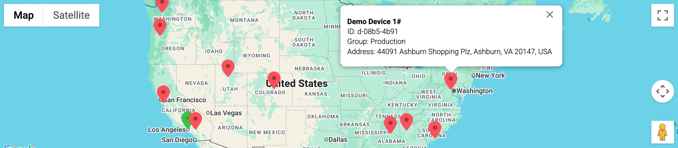 You can view a map of your device locations in the Fleet Overview page. Go to Overview in the left navigation tree and scroll down to the map. Each peg on the map represents a device. Green pegs are online and red are offline. When you click a peg, you can see more details about the device.
