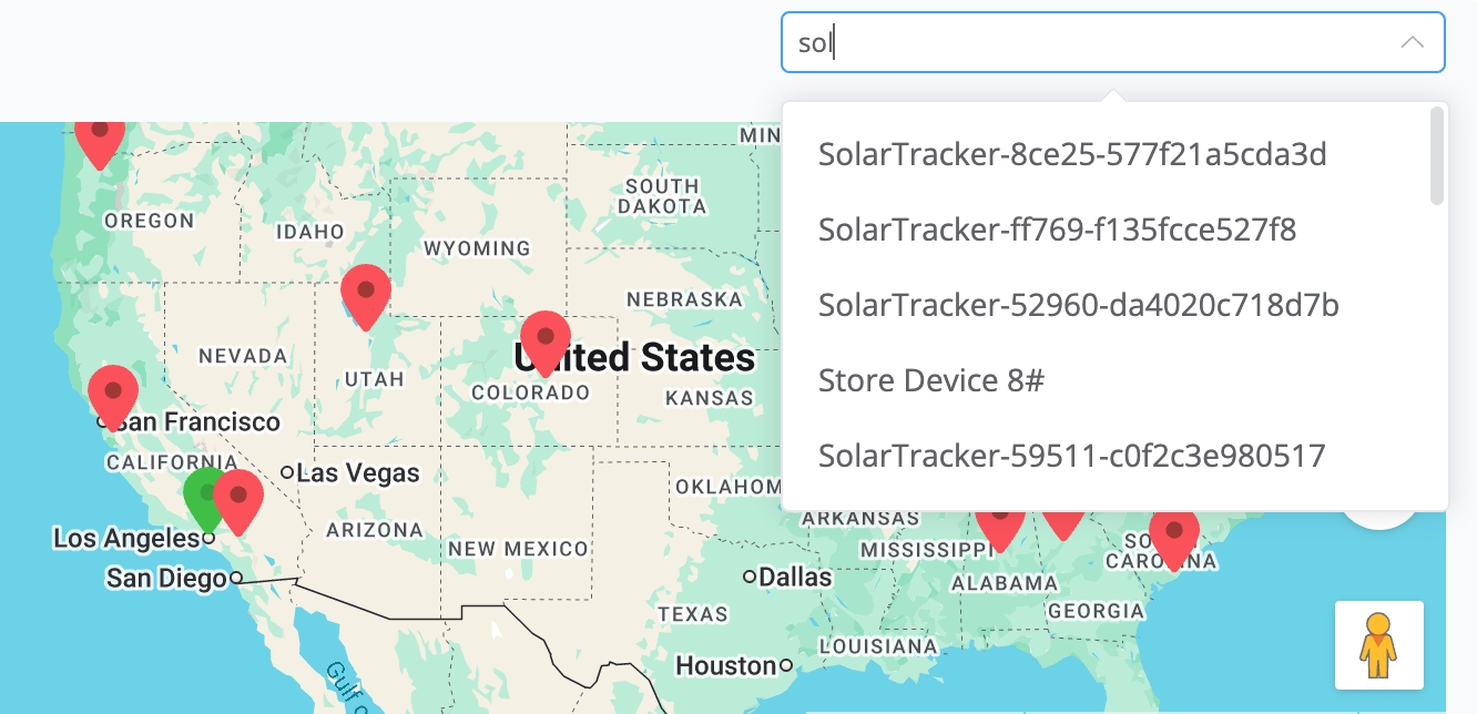 If you know the device name, you can use the map to find the location of a device. Just choose the device name in the dropdown list above the map, and the map will focus on that device and display its details.