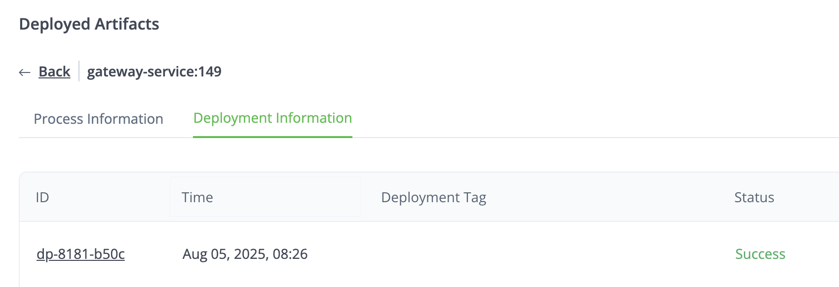 Deployed Artifacts Details: Click the arrow (>) in the row to see the Process and Deployment information.
