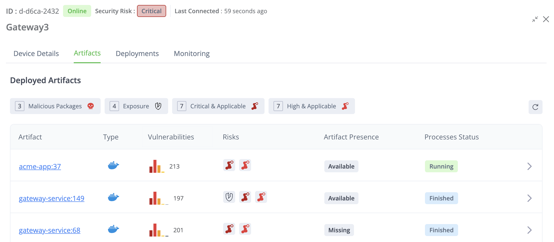 Risk assessment: An overall risk level calculated for each device based on the JFrog XRay security analysis, helping you prioritize your attention. In addition, for each artifact you can see a summary of vulnerabilities by severity and a breakdown of risks detected.