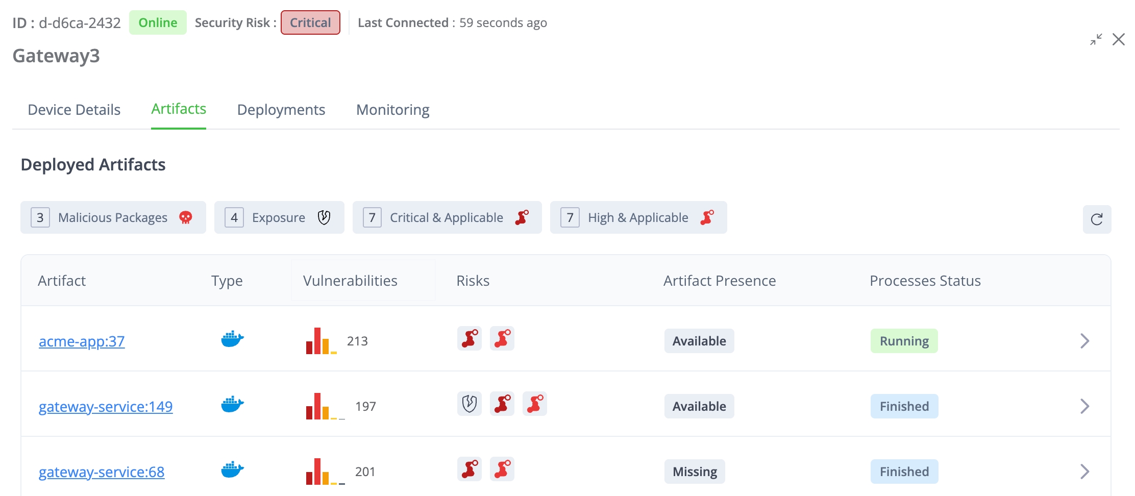 The Deployed Artifacts table lists each artifact that was downloaded from Artifactory to the device and provides security and status information about the artifacts. There is one row for each Artifact+Version downloaded.