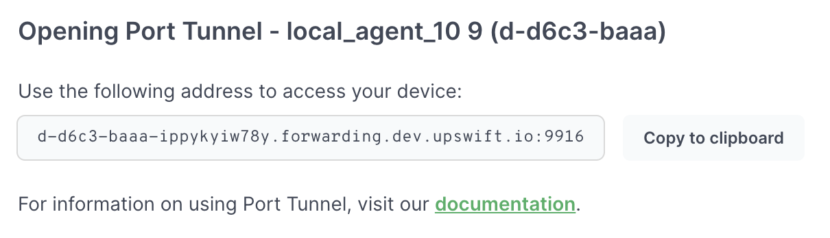 Click Open Tunnel. Wait until Connect produces the remote access address as shown below. You will use parts of this address to construct a command as shown in the next step and the example below.
