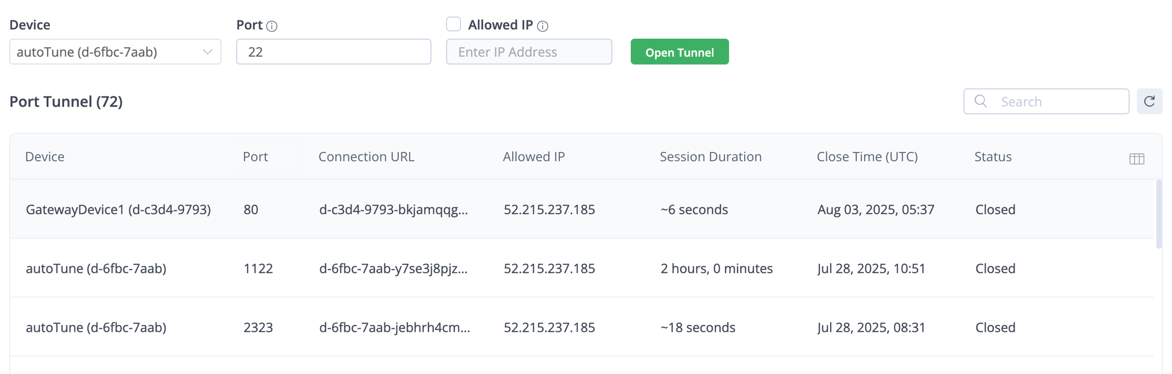 Go to Remote Tools/Port Tunnel and choose the device you want to access. Only online devices are shown in the dropdown list.