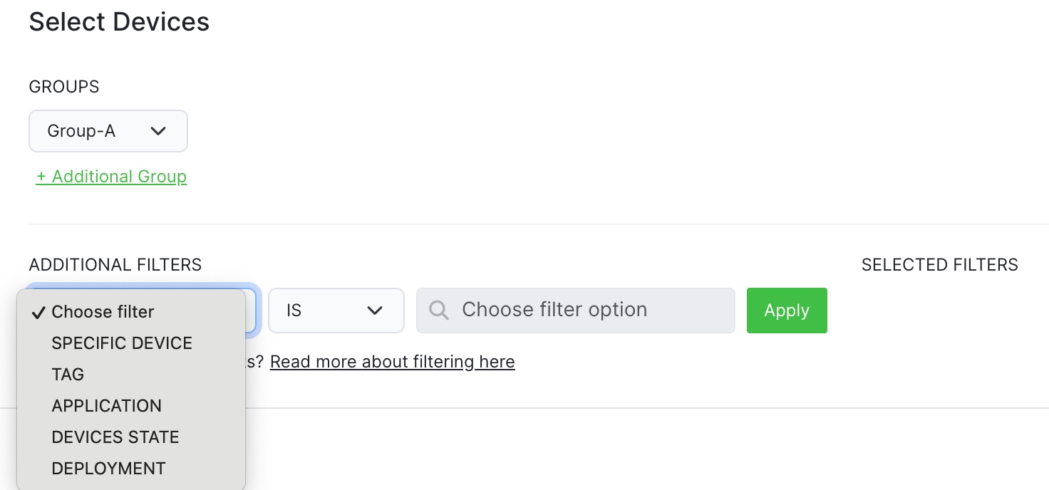 In the New Deployment popup, choose the devices that will be updated. This includes choosing the Groups and any Additional Filters for devices in your fleet.