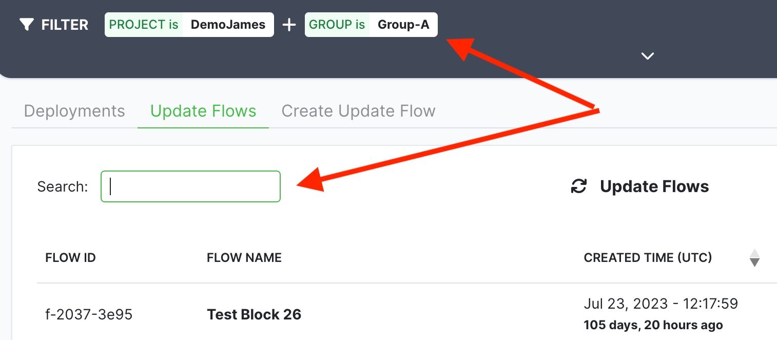 In the list that appears, look for the Update Flow you want to deploy. If you don’t see it in the list, choose the correct Project and Group in your fleet. You can also use the Search to locate your update flow.