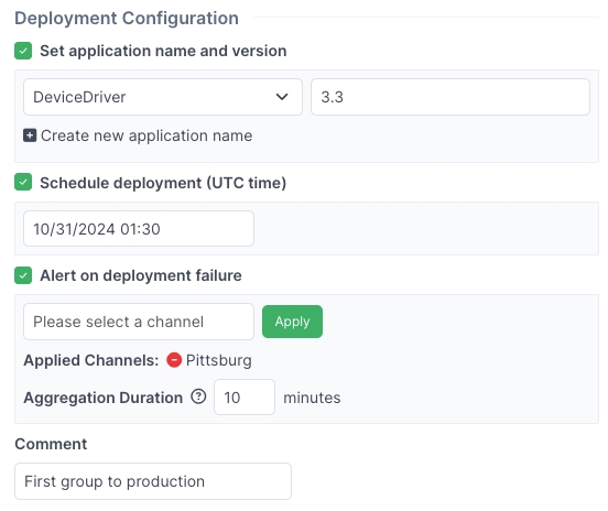 Schedule Deployment: Enter the date and time for the deployment to begin. JFrog Connect will trigger the deployment at the time you specify. If you don’t specify a time, the deployment is triggered immediately after you click Create Deployment in the web UI (or immediately after the API command is processed).