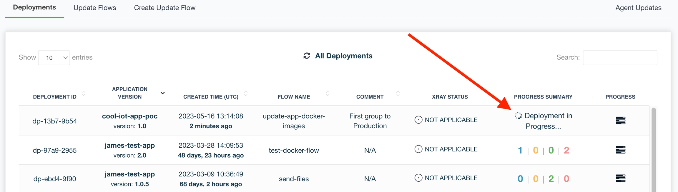 Once you have filled in all the configuration and deployment parameters, click Create Deployment. The deployment will appear in the list of All Deployments, as shown below, and you can find the deployment status under the Deployment Summary.