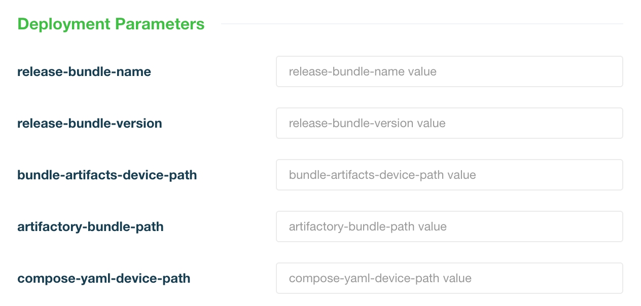 Some examples of deployment parameters and values are shown below for the Release Bundle action block. If you entered parameters for custom paths, they would also appear in the Deployment Parameters list and you would need to fill in their values. (The table below does not have custom paths.)