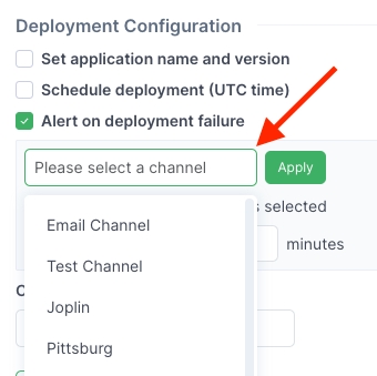 Choose an alert channel from the dropdown box and click Apply. You can do this again if you want to define multiple channels. For large deployments, it is recommended to choose channels that have bundling (alert aggregation) enabled.