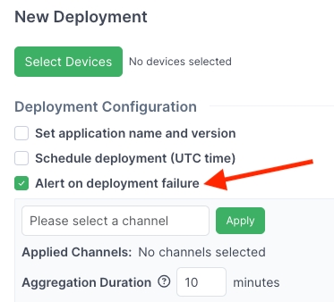 When your software deployment is to a large number of devices, there could be many failures within a short period of time. JFrog Connect’s default behavior is to send an alert for each failure. However, you can choose to aggregate several alerts into a single message by defining an aggregation duration. For example, if you enable alert aggregation and define an aggregation duration of 10 minutes, you will receive only a single notification over a 10 minute period, and each notification will list all the failures that occurred during the 10 minutes.