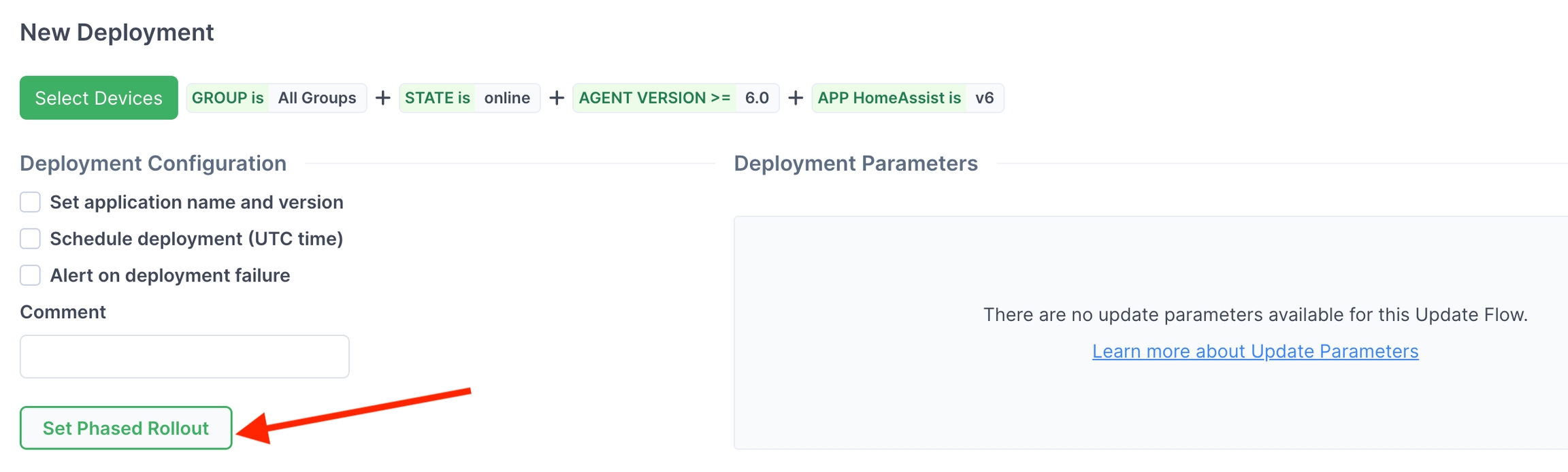 Group Athat you want to be in Phase 1 with tagphase-1.Choose Deployment Filter: In the New Deployment form, in the Groups list, choose