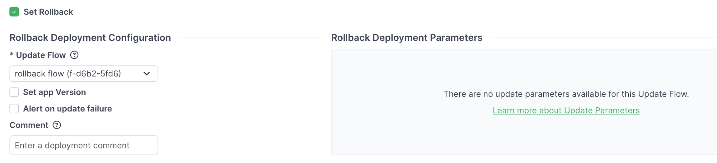 (Optional) In the Rollback Deployment Configuration, select an update flow to run as a rollback when a phase fails. Complete the other parts of the rollback configuration (Set App Version, Alert on Update Failure, and Comment).