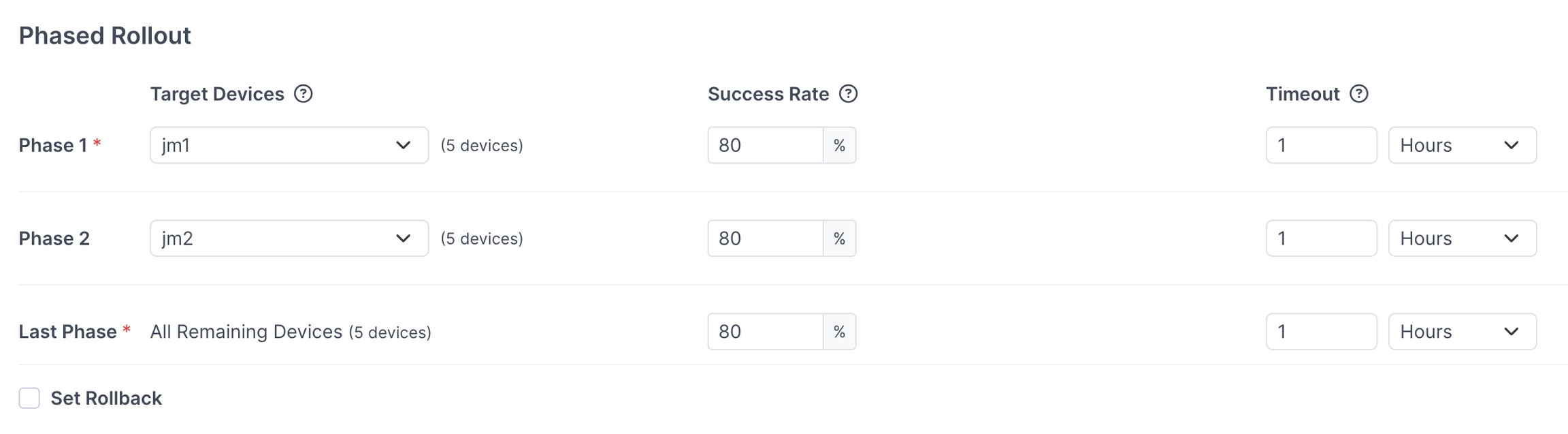 JFrog Connect enables you to create a software deployment and divide it into phases. In each phase, Connect deploys software based on tags that you have assigned to the devices. You can define the success criteria required to move on to the next phase and configure a rollback in case a phase has failed.