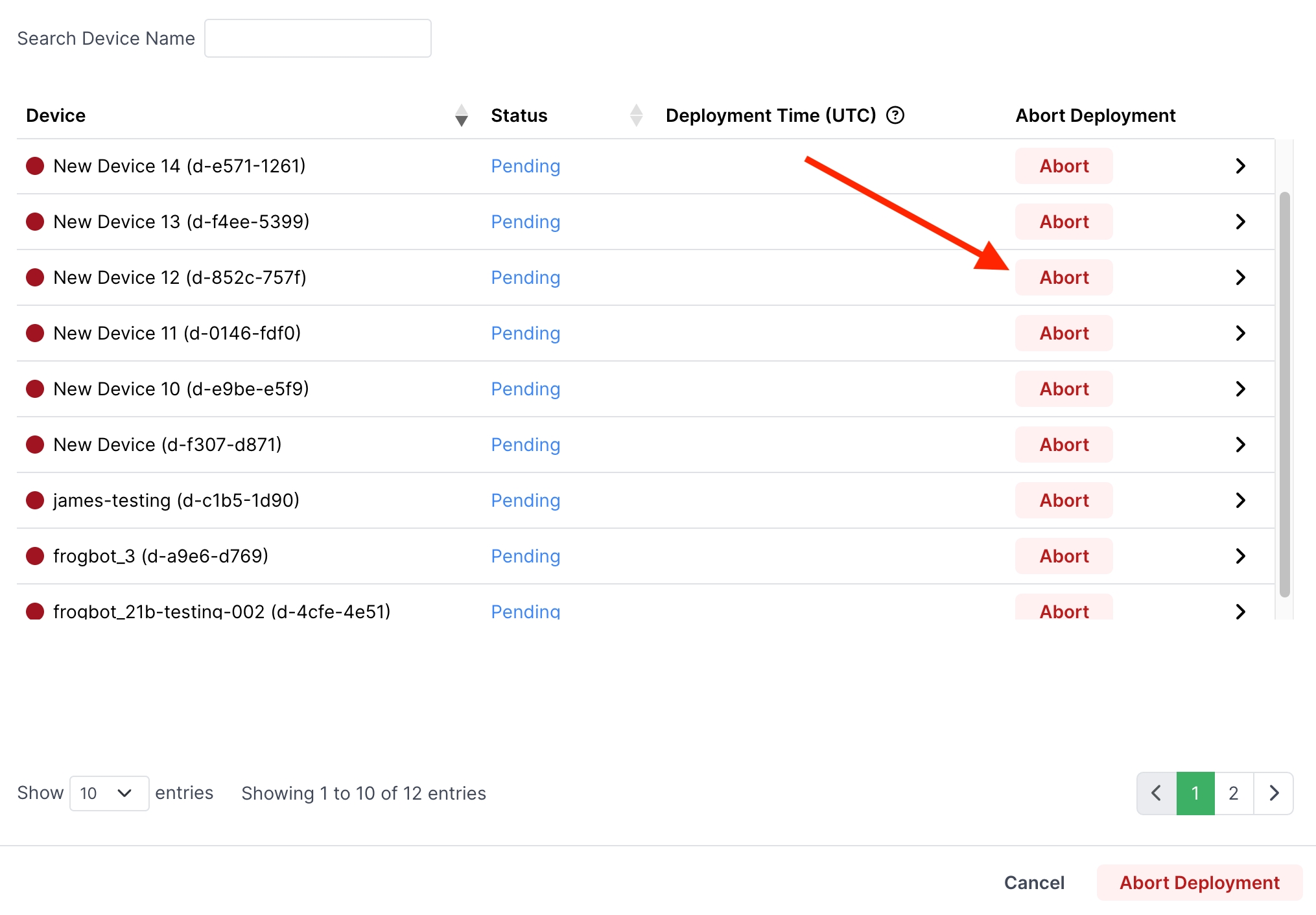 To abort the deployment to a specific device, go to the row of the device and click Abort.