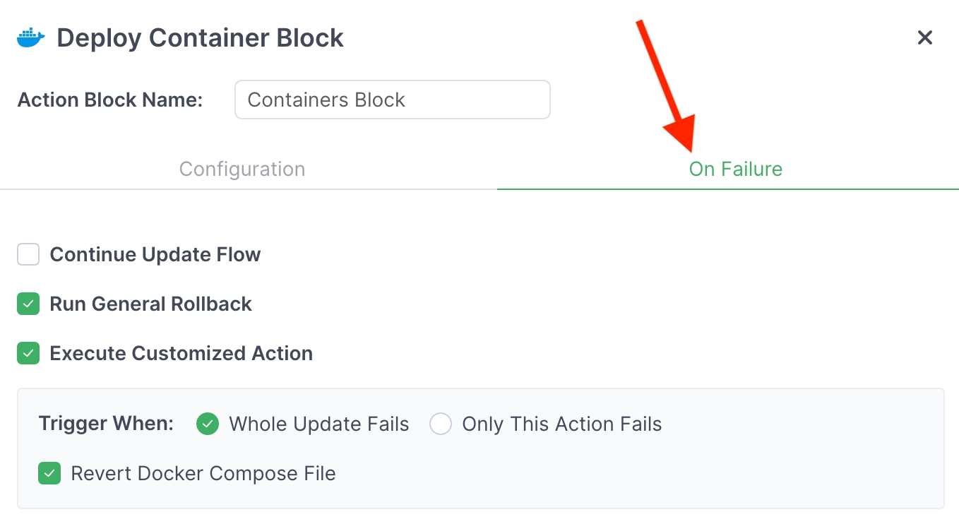 After you have completed the configuration, click On Failure to configure your failure policy. Upon failure, the default Do Action is Revert Docker Compose File. This means that if the action or update fails, the rollback will revert to the Docker Compose file of the last successfully running application.