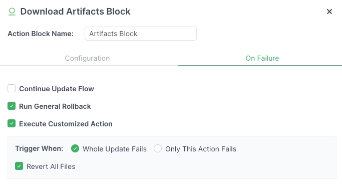 Continue Update Flow: If the Download Artifacts action fails, Connect will simply continue with the next action in the update workflow.