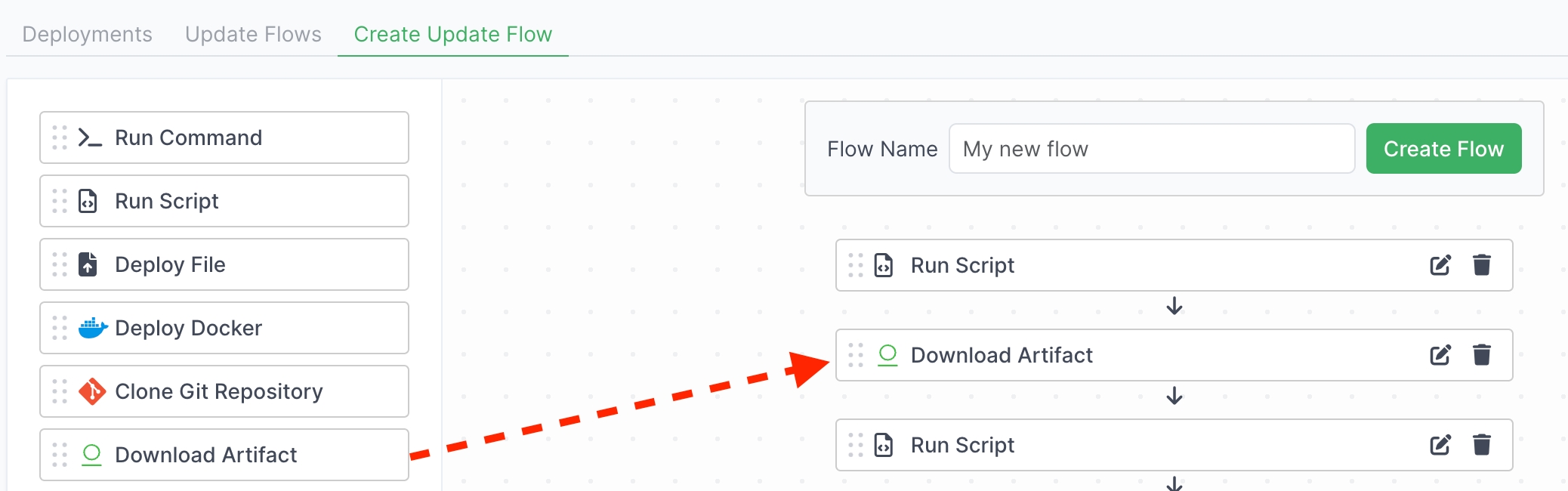 The Download Artifact action enables you to create a workflow that pulls artifacts from your Artifactory instance and deploys them to your edge devices. You can one or multiple artifact actions in an update flow.