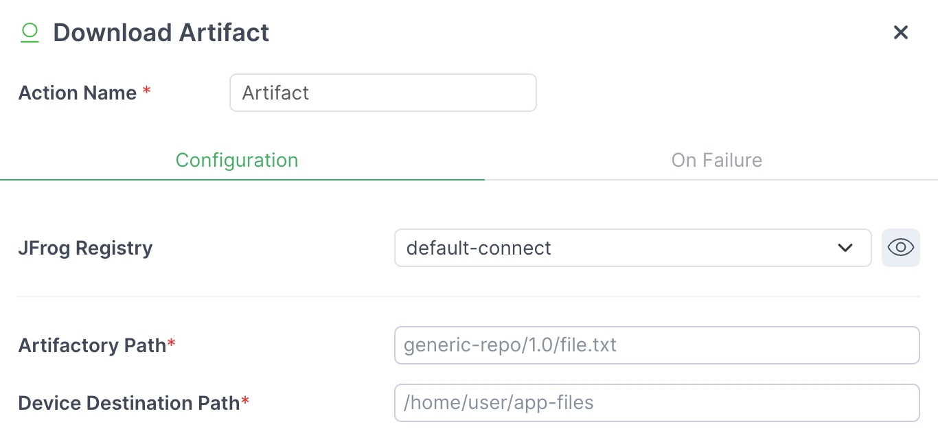 The Download Artifact action enables you to deploy updates to your devices by specifying a path in JFrog Artifactory to a destination path on your device.