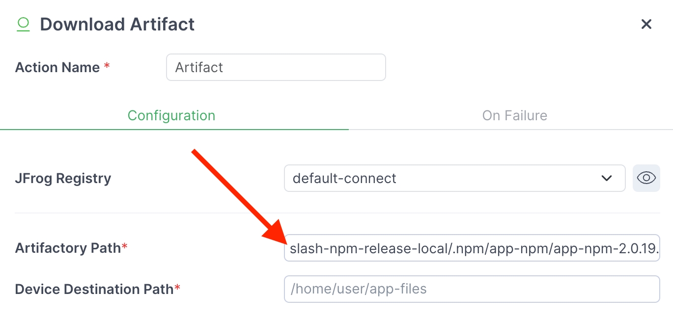 Get the Artifactory Path you need to configure an update flow action in JFrog Connect.
