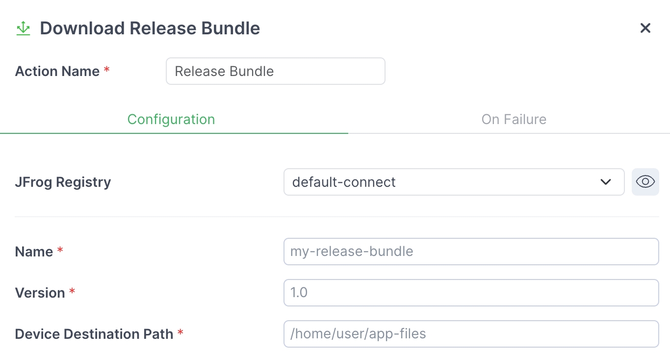 The Download Release Bundle action utilizes JFrog’s packaged release cycle to deploy your entire application to your edge devices.