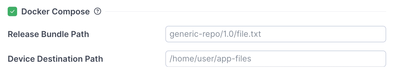 (Optional) If your release bundle includes Docker images, mark Docker Compose, then specify the Release Bundle Path and the Device Destination Path for the Docker Compose YAML file.