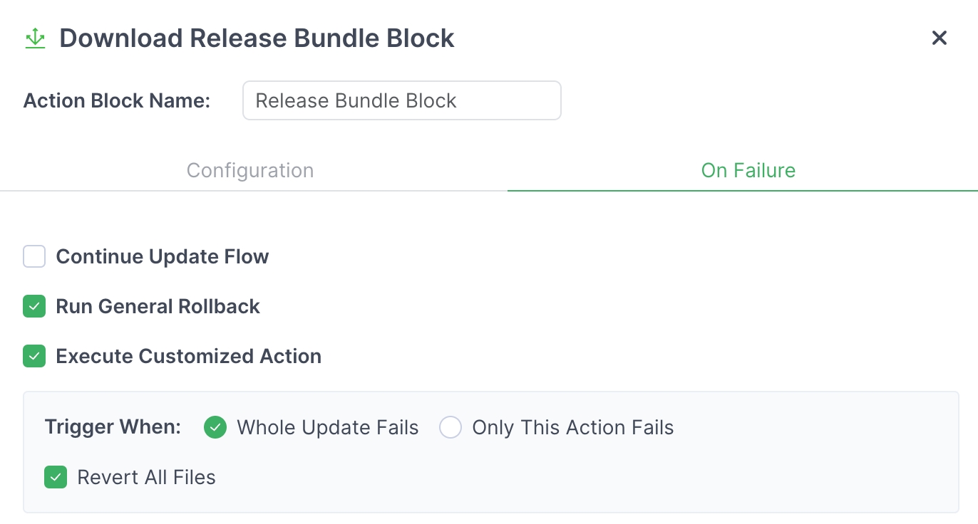 Continue Update Flow: If the Download Release Bundle action fails, Connect will simply continue with the next action block in the update workflow.