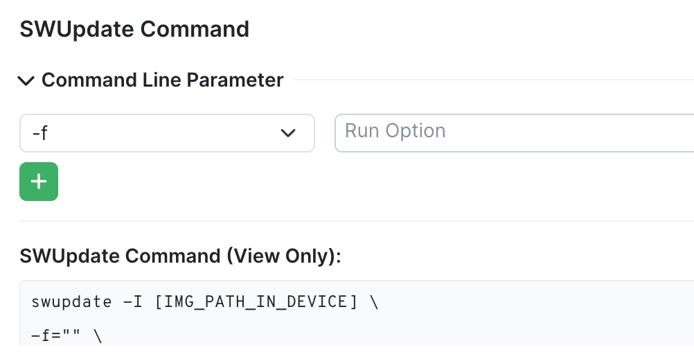 The action runs SWUpdate CLI commands like the default command shown below. You can enter additional commands and run options for the action to run on the device. For each additional command, click the + and choose the command and run option. The display at the bottom enables you to review the full command that will be run before you save the action.