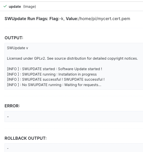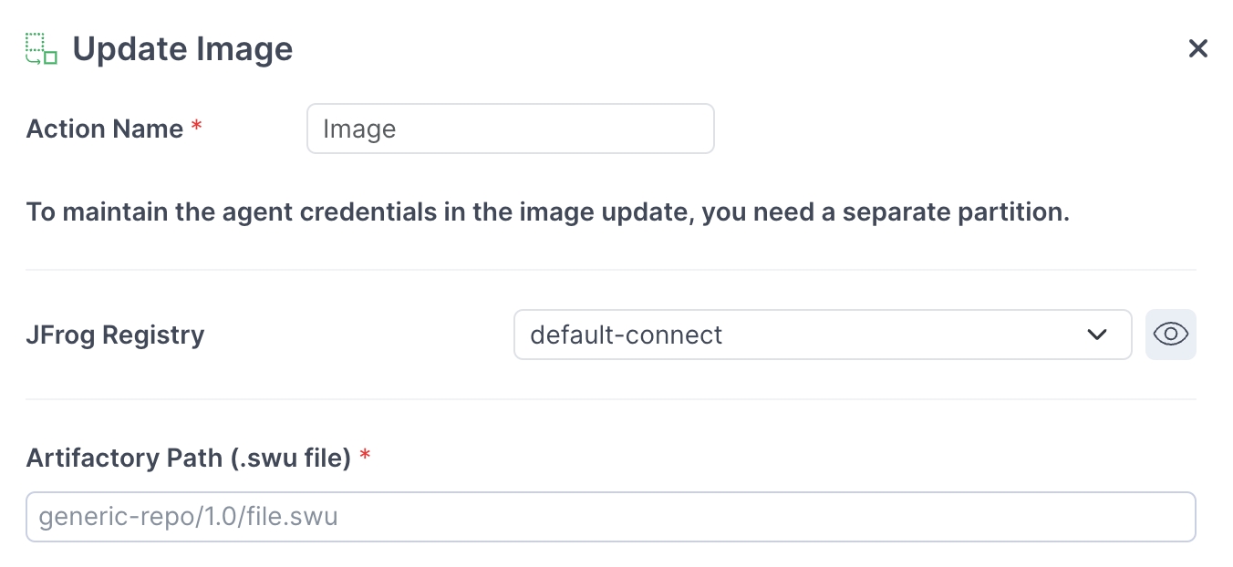 The Update Image action enables you to easily update device images at scale. JFrog Connect integrates SWUpdate functionality to provide a robust and scalable method of deploying image updates.