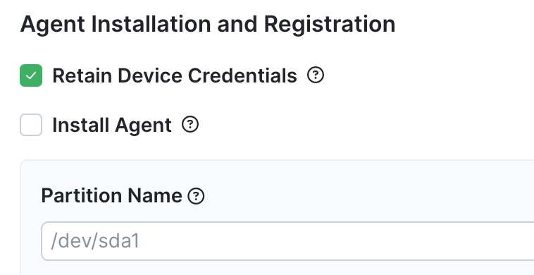 Retain Device Credentials: Mark this to keep the current device credentials in the new image. If you leave it unmarked, you will need to register the device again after the deployment is completed. This option is recommended if you want to install a new agent version and keep the previous device credentials.