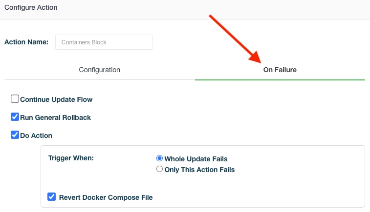 Of course, you can configure On Failure differently according to your use case requirements. For more detailed information about on-failure and rollback configuration, see the Rollback page.