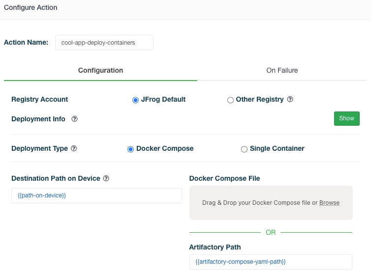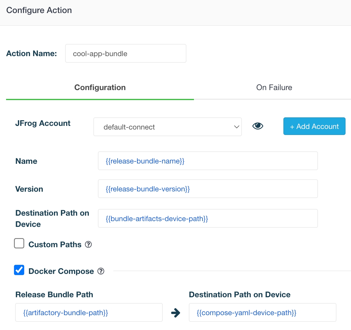{{artifactory-bundle-path}}.Destination Path on Device: Enter a parameter for the device path where the Docker Compose YAML file will be delivered, e.g.,