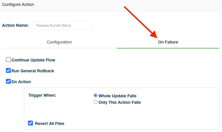 After completing the On Failure policy, save the action and complete the rest of the information required for the update flow.