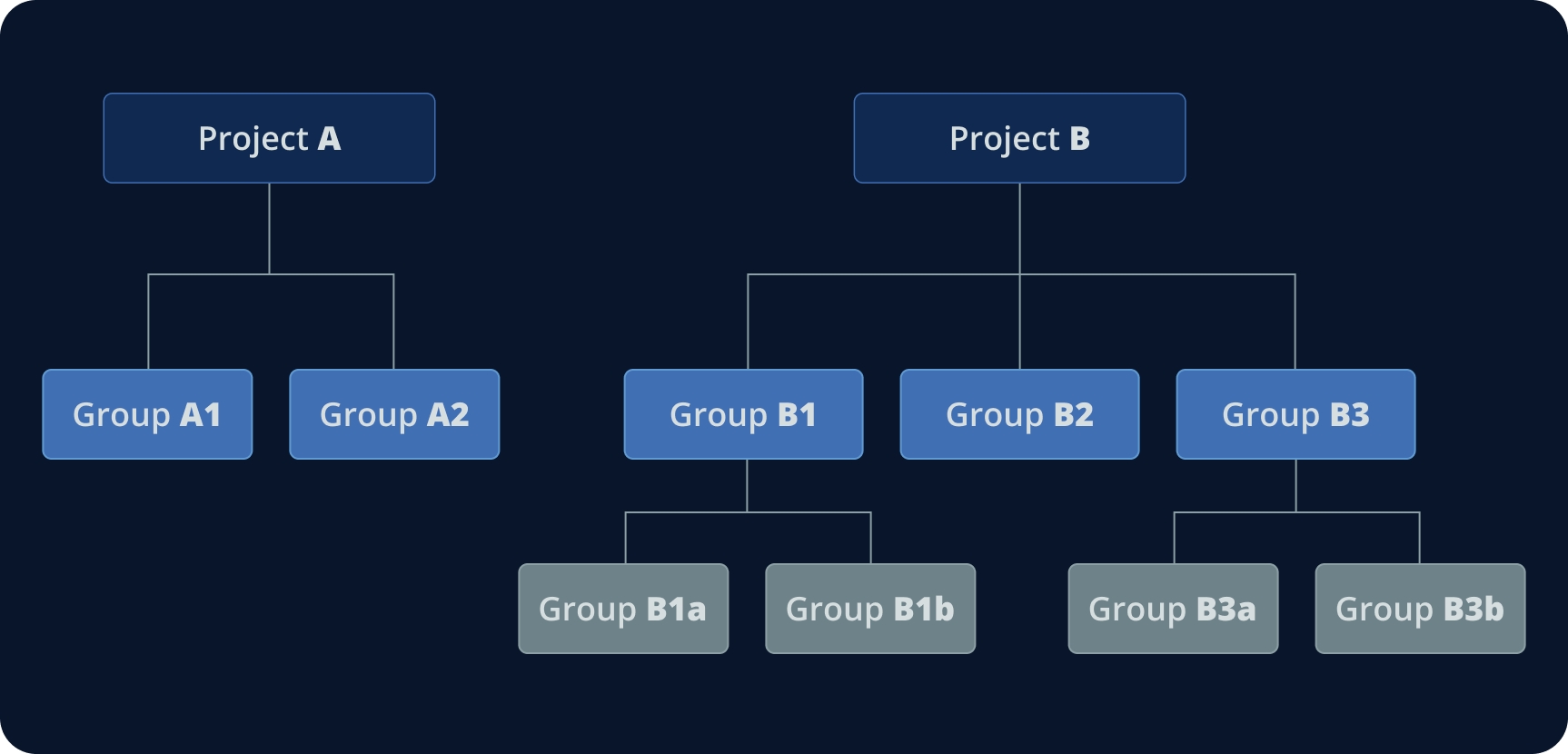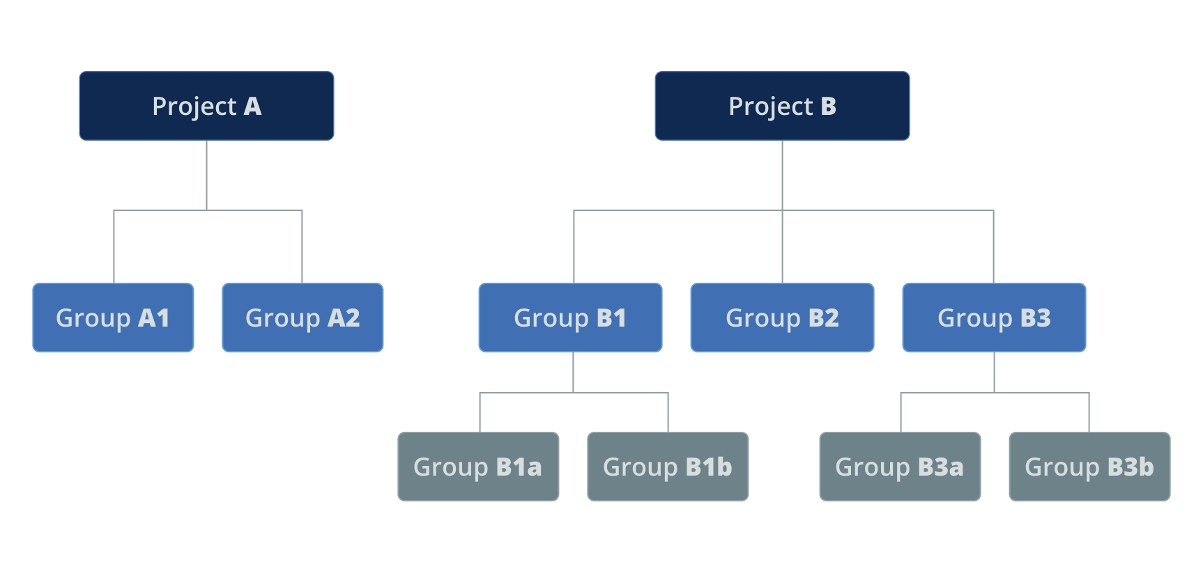 You can always create a new group in your project. In addition, you can create groups with a group. This enables you to create hierarchies that suit your business needs. Within a project, you can create two levels of groups in the hierarchy, for example, one level of groups and one level of sub-groups, as shown in the illustration below.