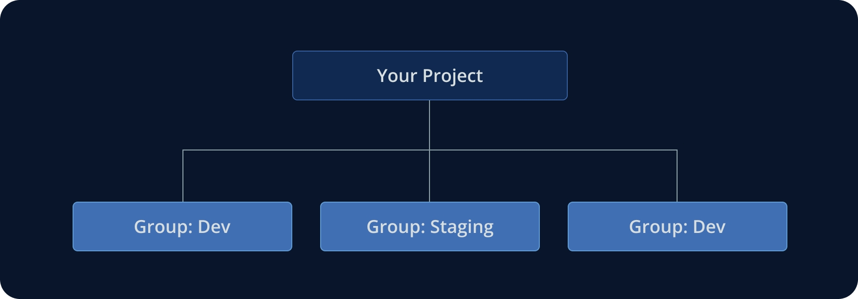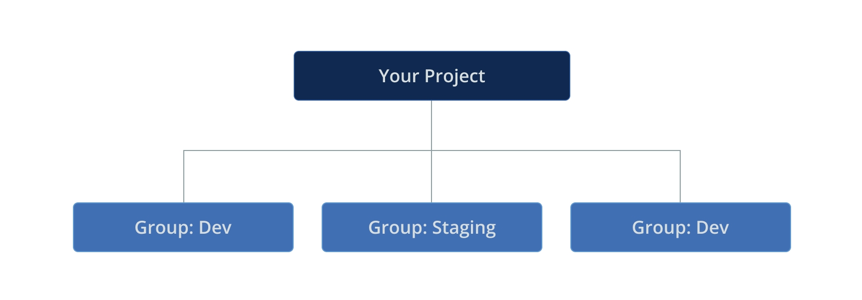 Within a project, you can divide the devices into groups. All of the groups within a project have the same project configuration, but they are made up of different devices. A typical example would be groups that distinguish between different stages of a project, such as development, staging, and production.