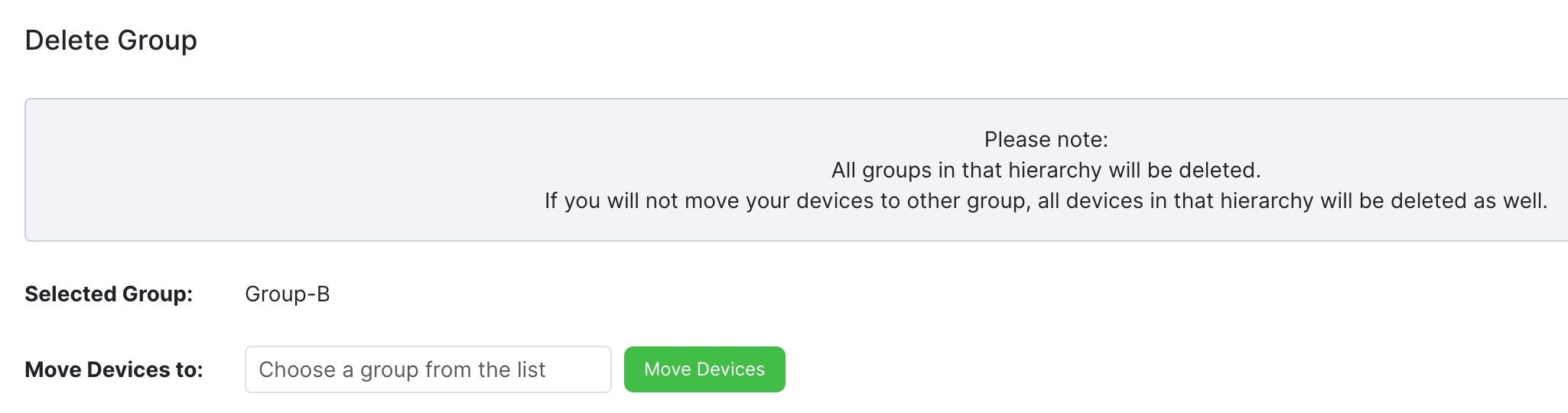 If there are any devices in the group you have chosen, they will be deleted with the group unless you move them. This is your last opportunity to move them. To keep the devices, choose a group from the list and click Move Devices. If you intend to delete the devices along with the group, just delete the group.