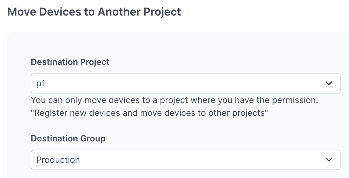 Destination Project: The name of the project to which you are moving the device(s). The dropdown list will display only the projects in your account where you have permission to register devices.