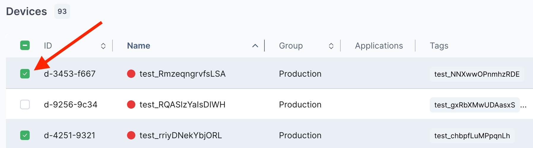 On the left side of the Devices table, mark the checkboxes next to the devices that will be moved. You can use the checkbox at the top of the column to mark all or unmark all of the devices.